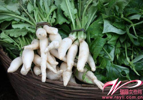 萝卜分白皮、青皮、红皮等多种,既可生吃,又可熟食,其维生素C含量为梨的10倍,还含有干扰素诱生剂,具有抗病毒、抗癌作用。萝卜性味辛、甘、凉,有消除积滞、化痰解热、解毒等功效,对支气管炎和咳嗽有疗效,所含木制素和辛辣味物质有防癌作用,且富含维生素C。萝卜能通便、抗菌,防胆结石的形成,降胆固醇,可预防高血压和冠心病。生吃萝卜通便,每次可吃250克左右。