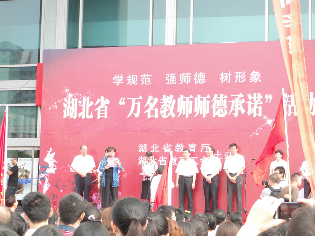 9月11日,湖北省教育厅、湖北省教育工会在武汉市洪山礼堂广场(主会场)联合开展主题为“学规范、强师德、树形象”的全省“万名教师师德承诺”活动。