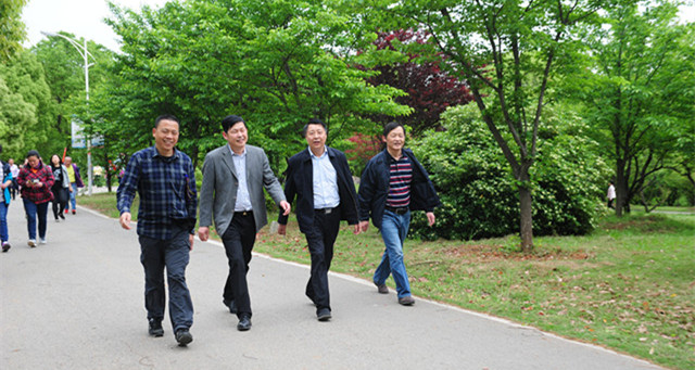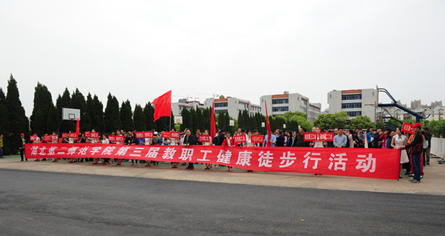 教职工在黄颂的带领下,从青藤园篮球场出发、途径行政楼、一号教学楼、二号教学楼、学子餐厅、图书馆、行知广场、楚才源,最后回到青藤园篮球场,绕行两圈进行校园徒步活动。